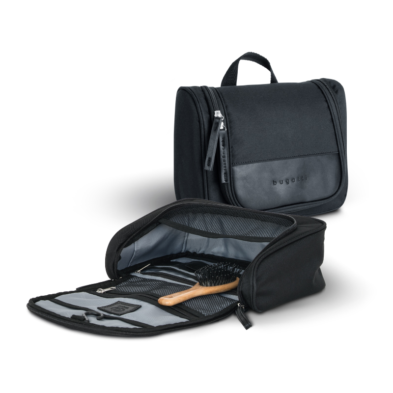 Die bugatti Kulturtasche zum Aufhängen bietet mit ihrer praktischen Aufteilung viel Platz für Kosmetik-und Pflegeprodukte. Aus strapazierfähigem Polyester hergestellt.